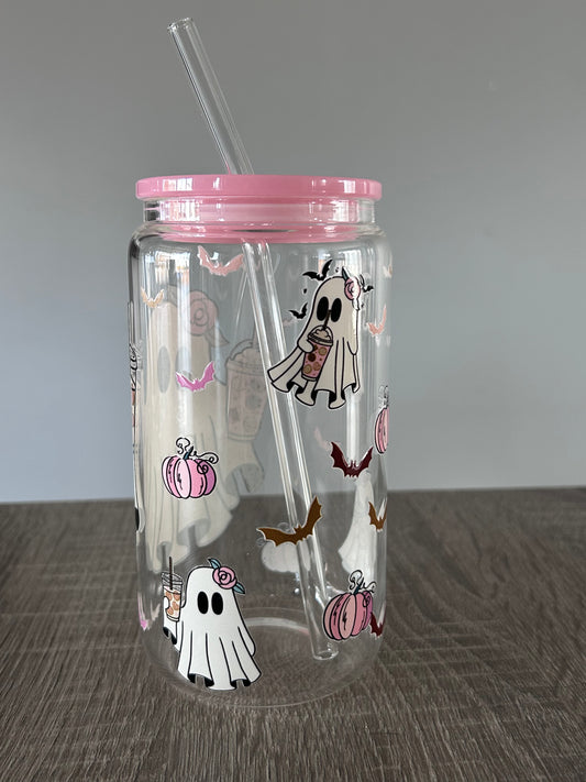 Tumbler en verre avec couvercle et paille (16 oz) - Ice coffee ghost đ»đ©·
