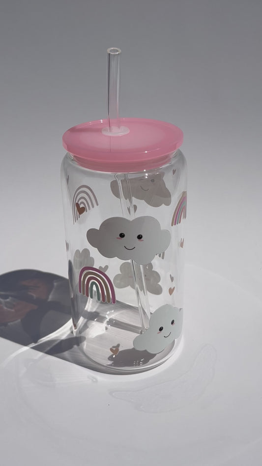 Tumbler en verre avec couvercle et paille (16 oz) - Nuage et arc-en-ciel ☁️🌈