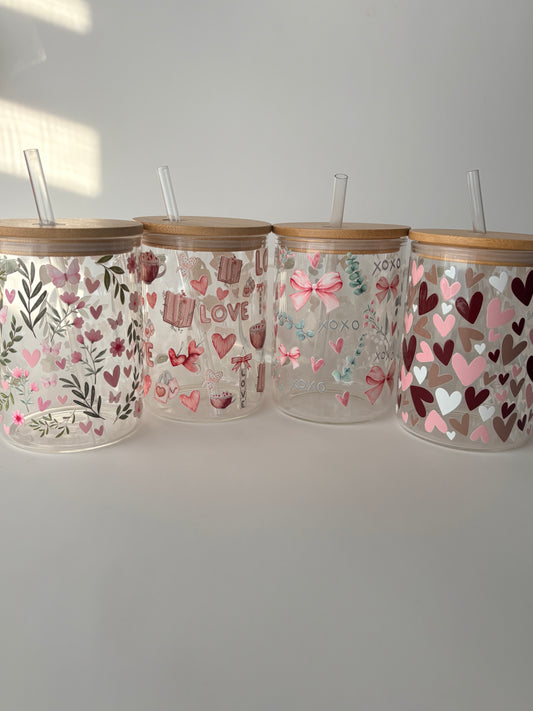 Tumbler en verre avec couvercle et paille (16 oz) - Hearts ❤️