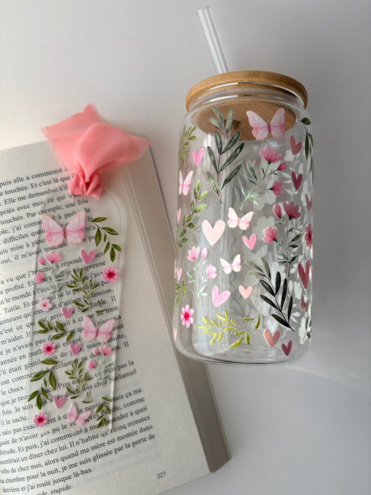 Tumbler en verre avec couvercle et paille (16 oz) - Coeur de papillons 🦋🩷
