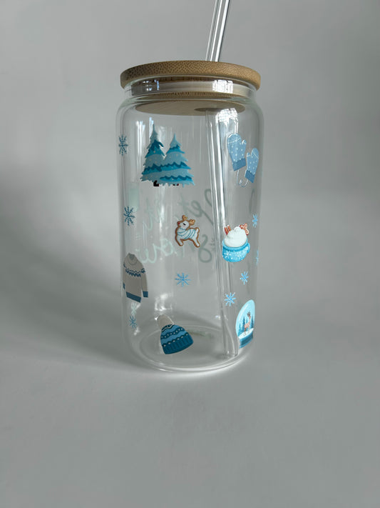 Tumbler en verre avec couvercle et paille (16 oz) - Let it snow ☃️