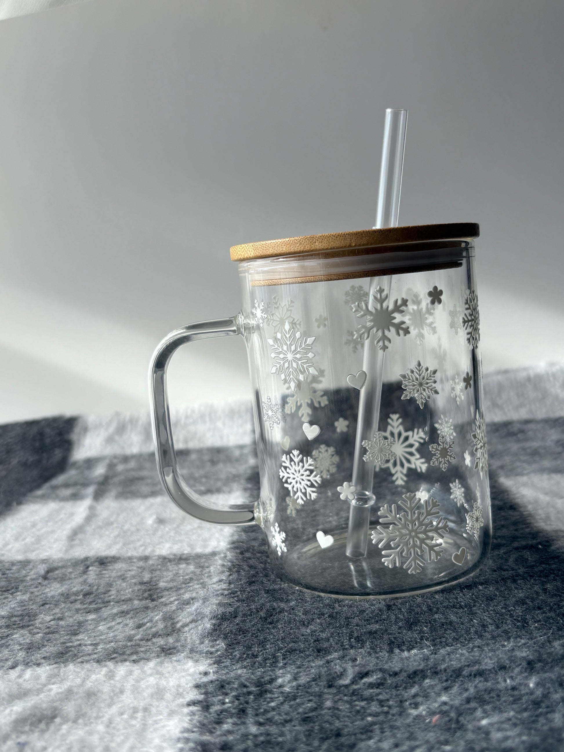 Tasse en verre avec couvercle et paille (17 oz) - Flocons