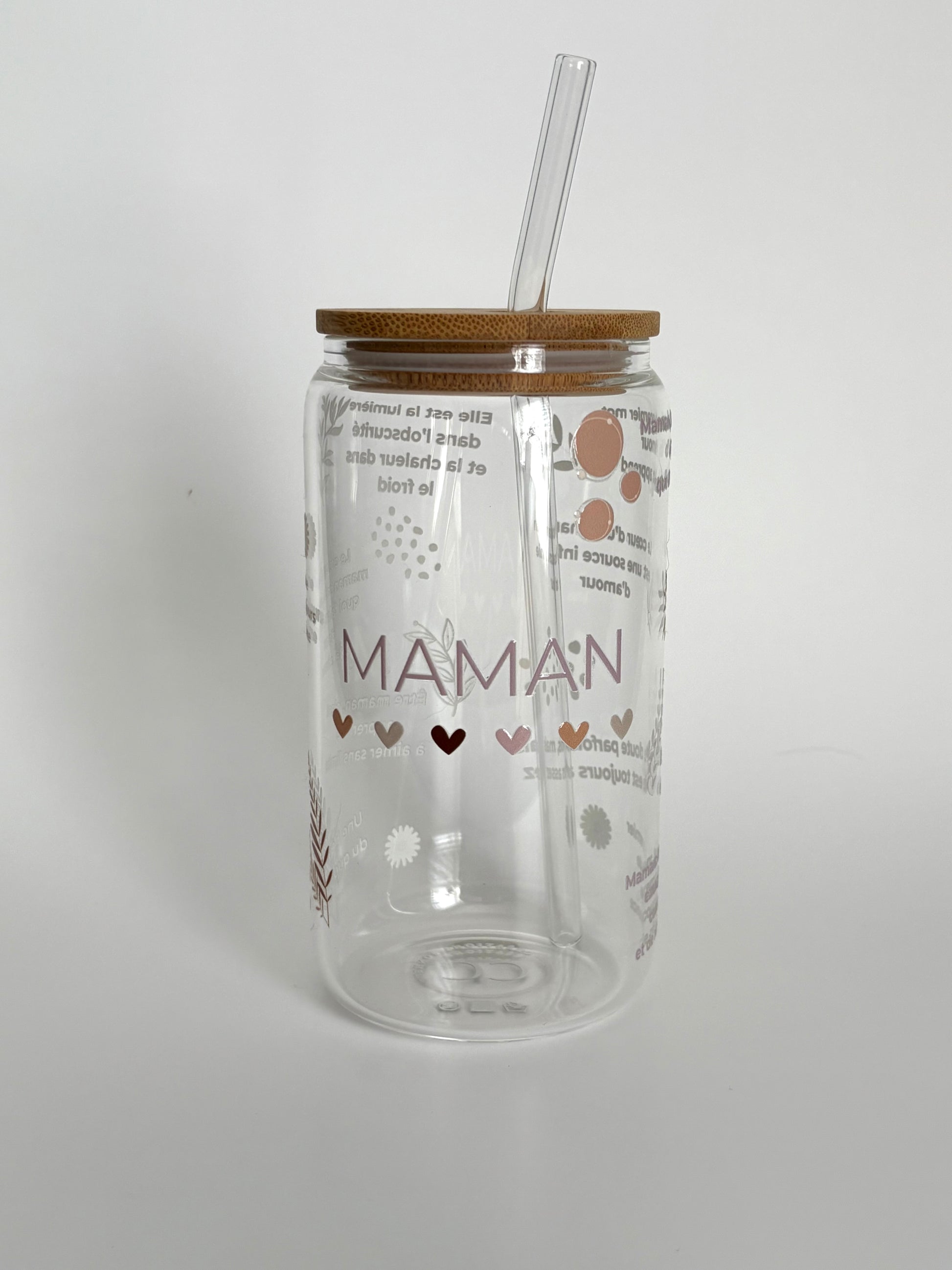 Tumbler en verre avec couvercle et paille (16 oz) - Coeur de maman 🤎
