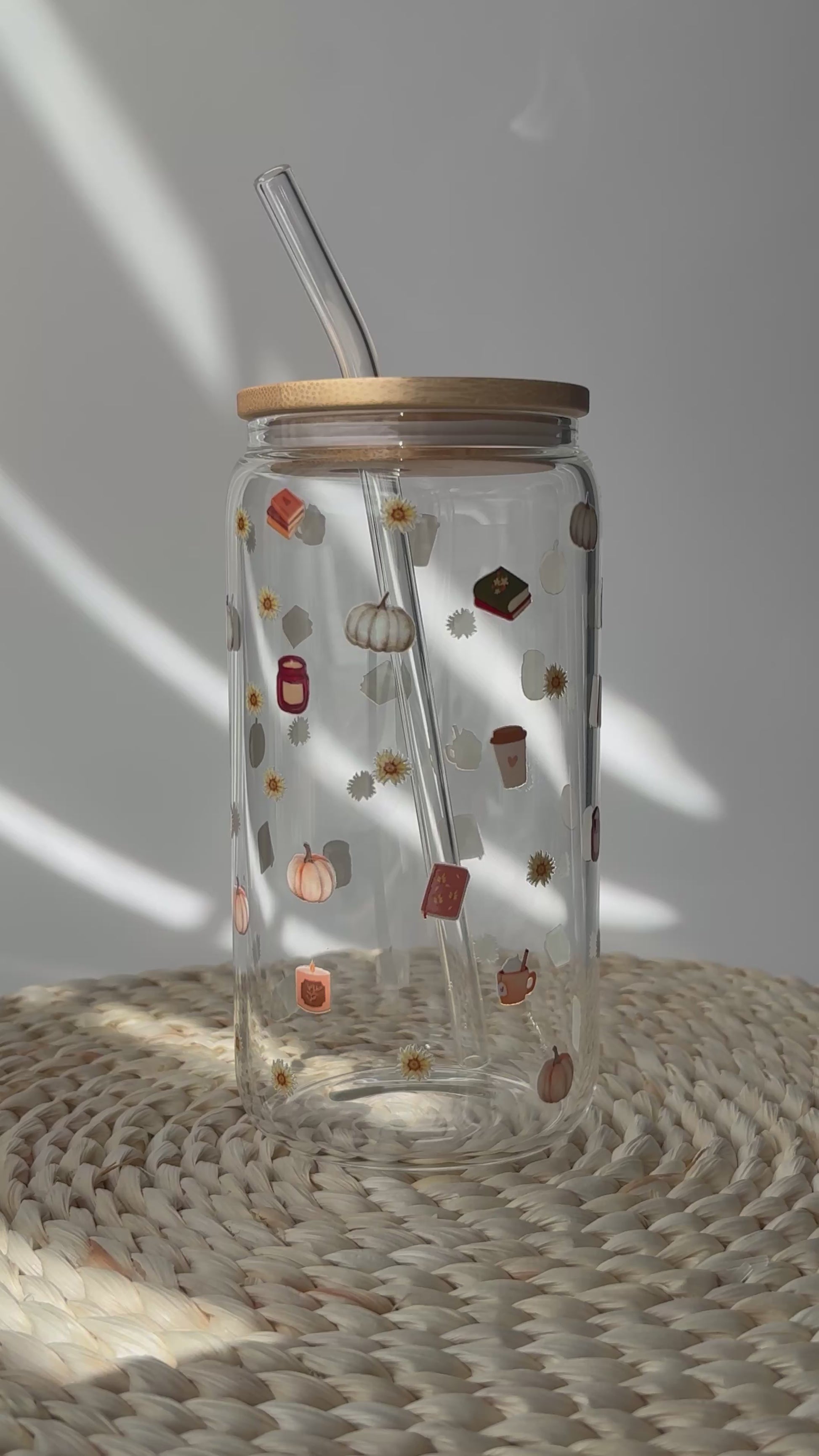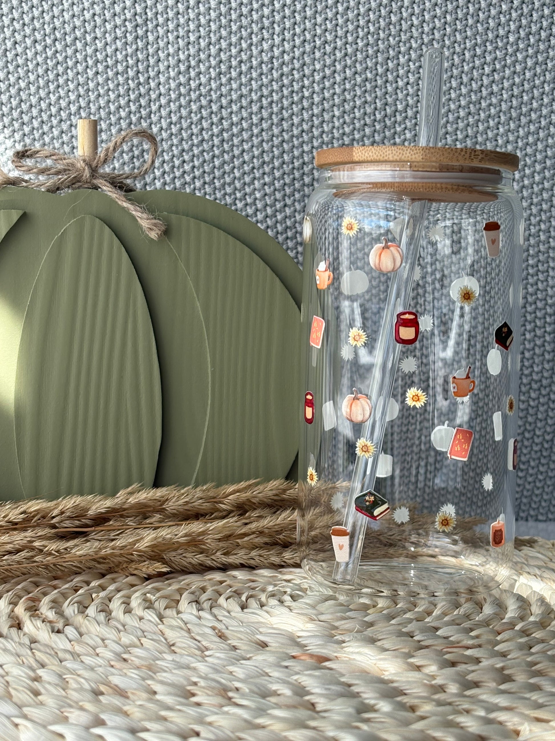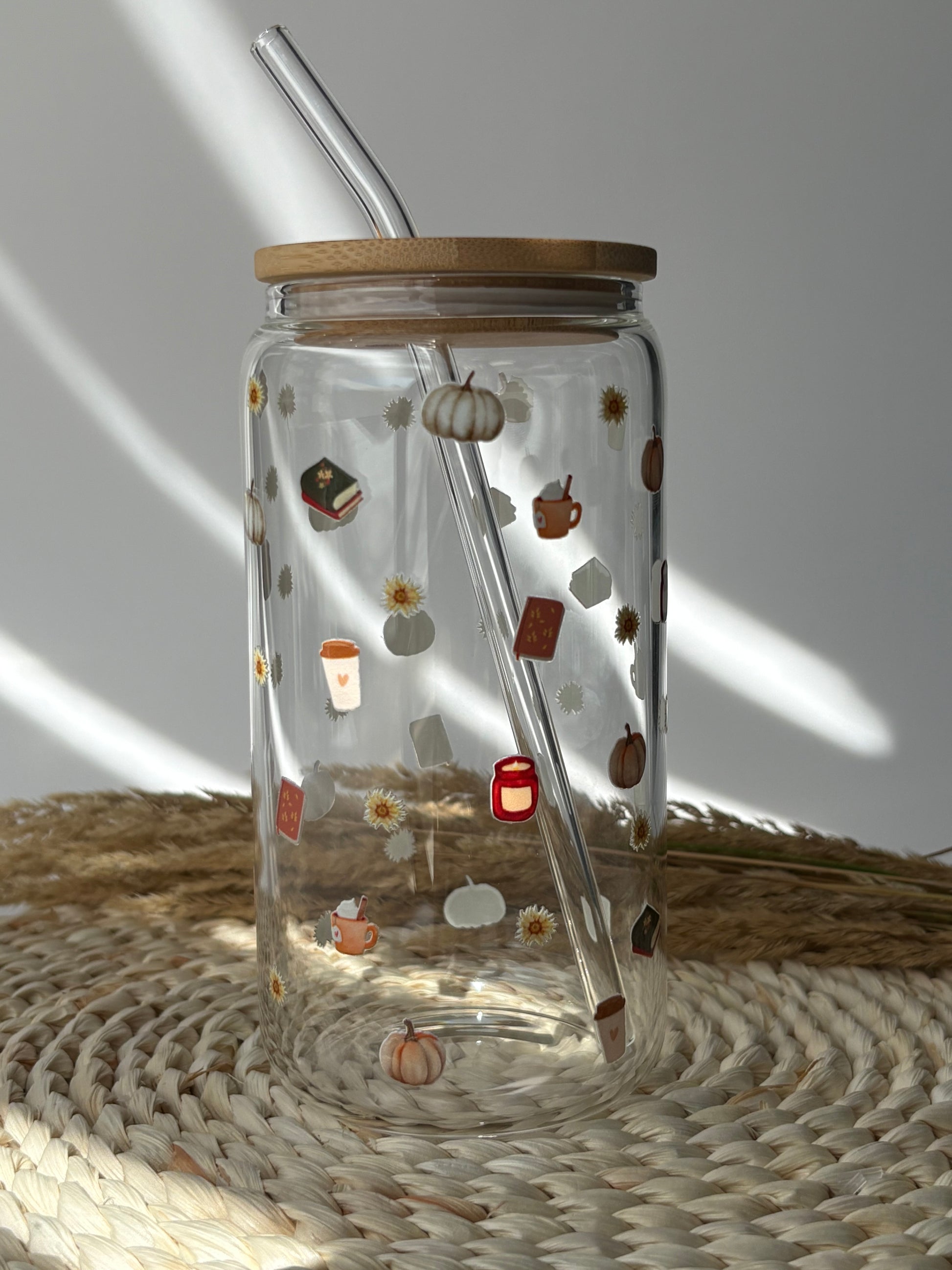Tumbler en verre avec couvercle et paille (16 oz) - Douceur d'automne ☕️📖🕯️