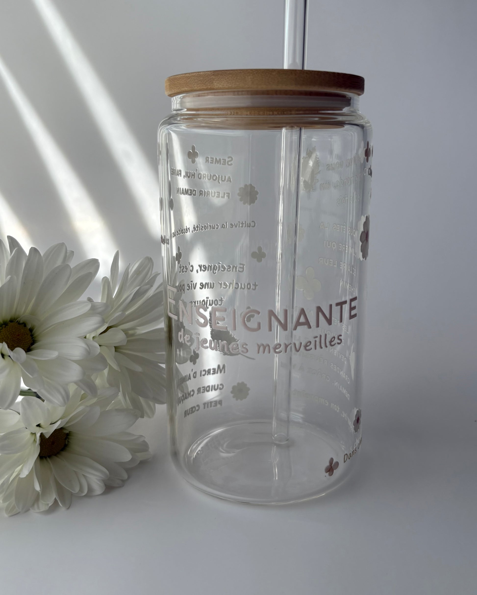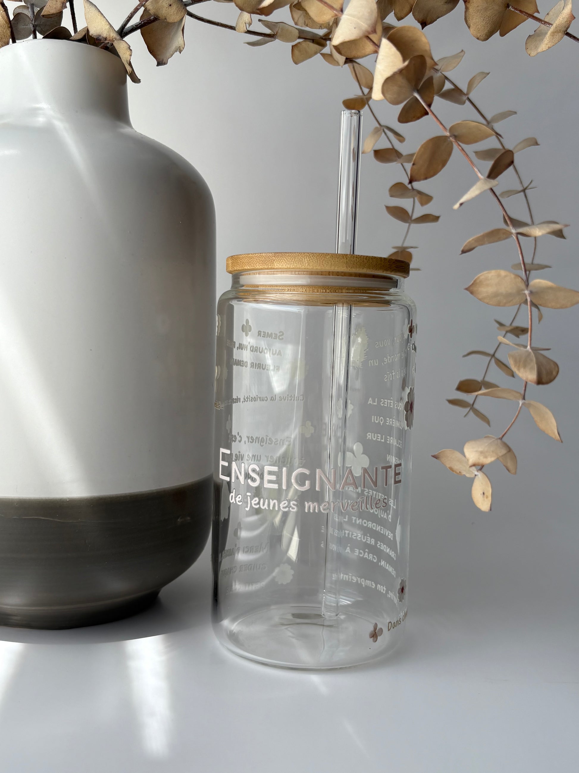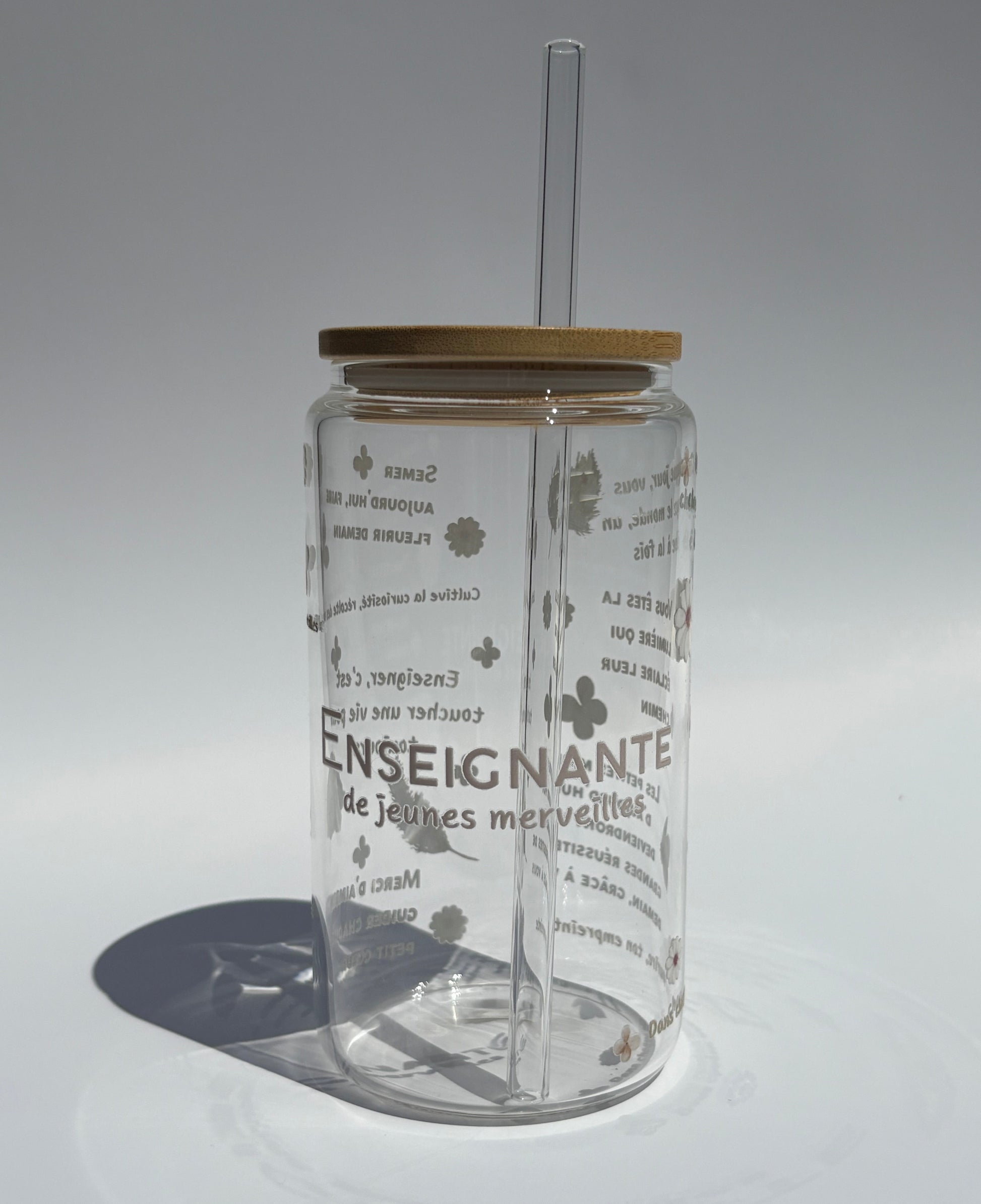 Tumbler en verre avec couvercle et paille (16 oz) - Enseignante de jeunes merveilles 🤎