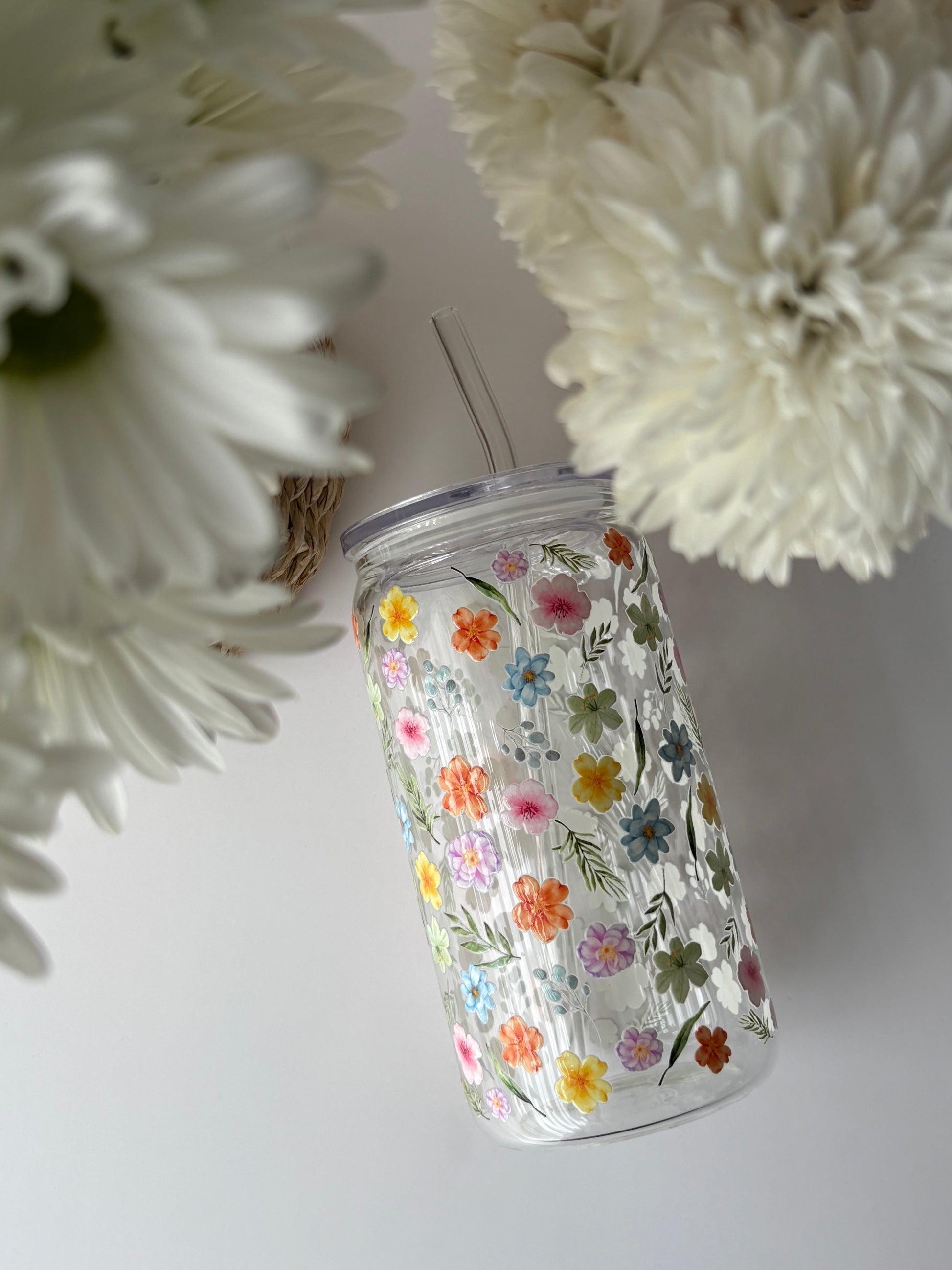 Tumbler en verre avec couvercle et paille (16 oz) - Floraison