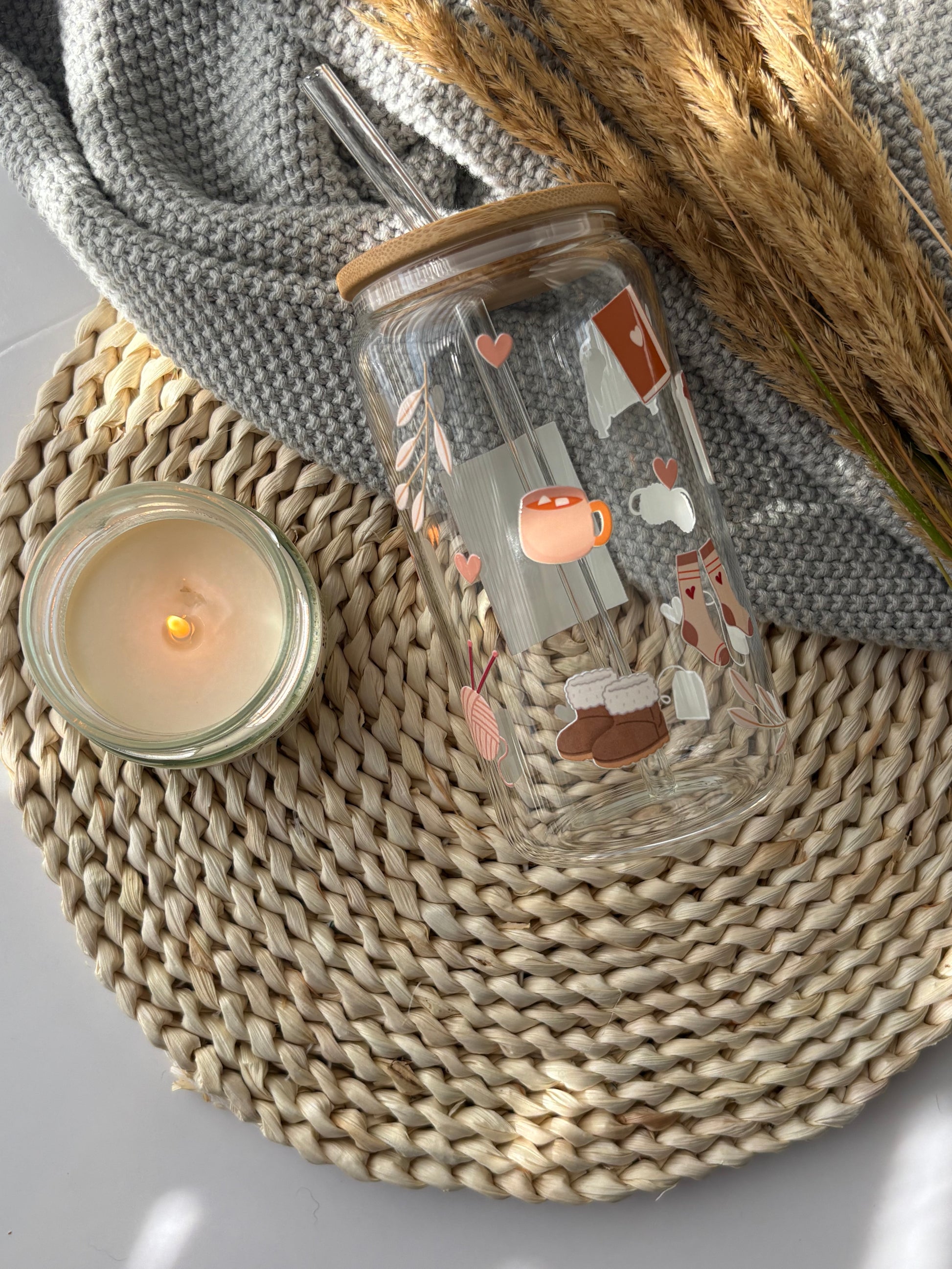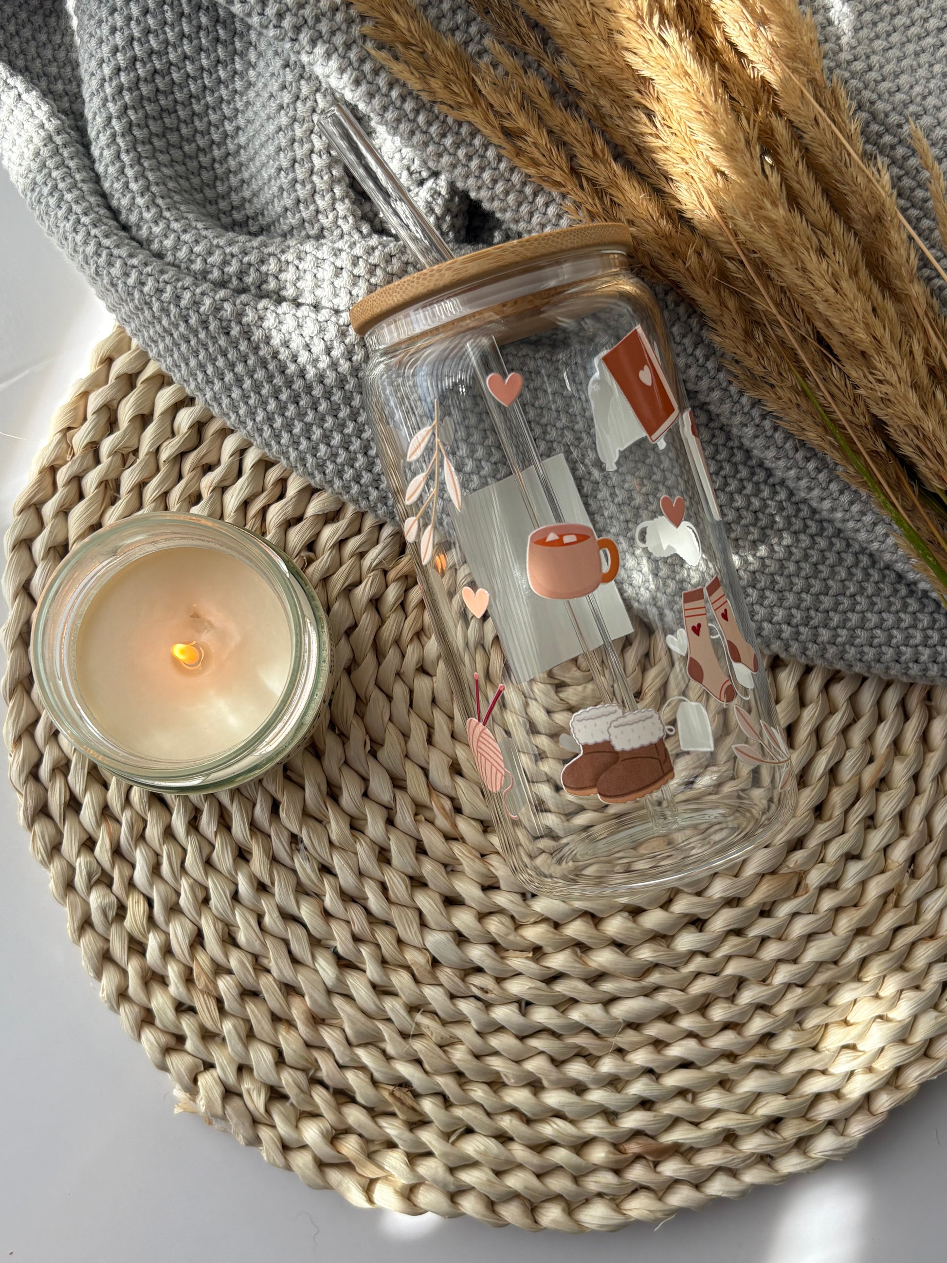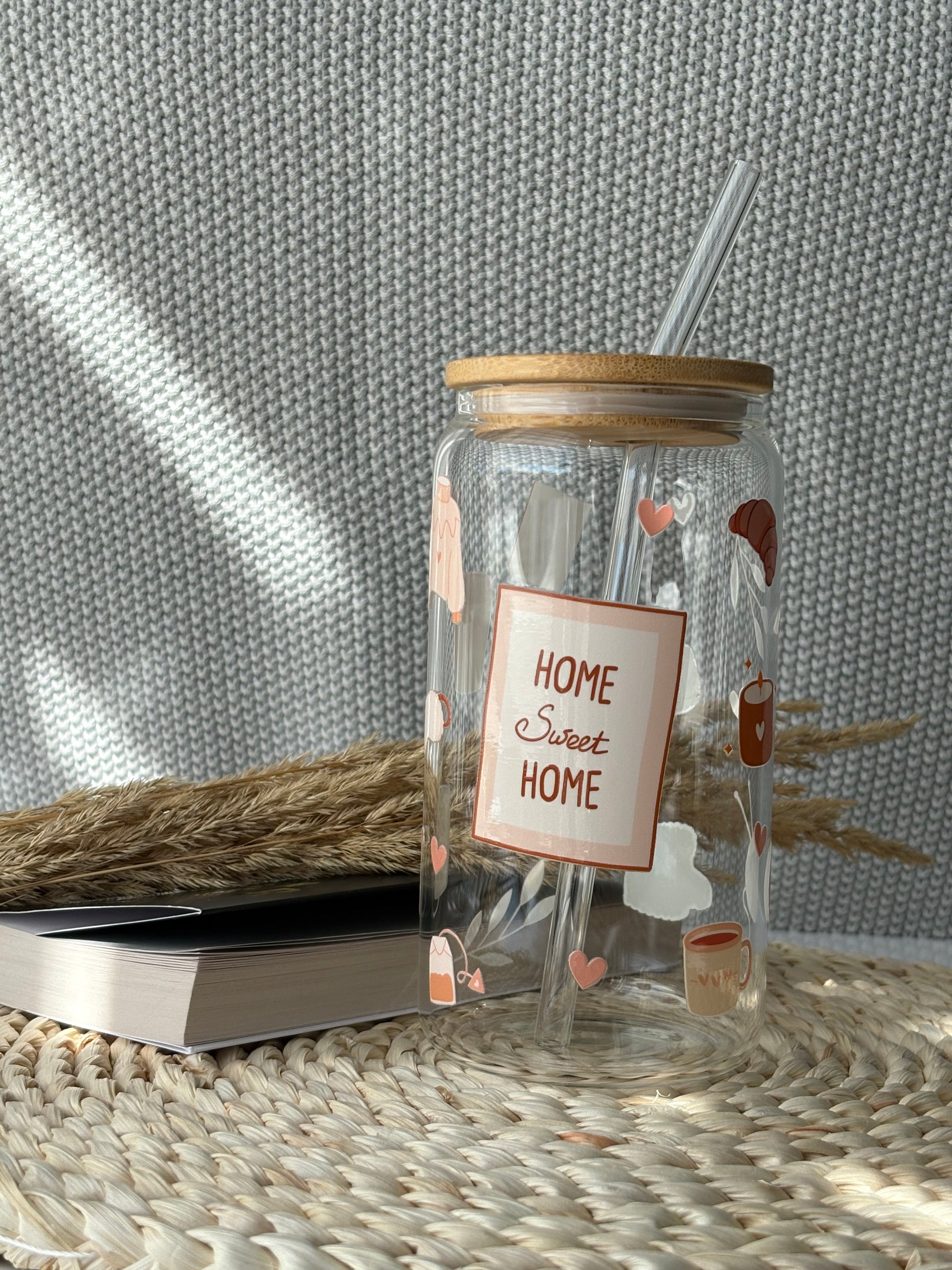 Tumbler en verre avec couvercle et paille (16 oz) - Home sweet home🧦🧶🫖