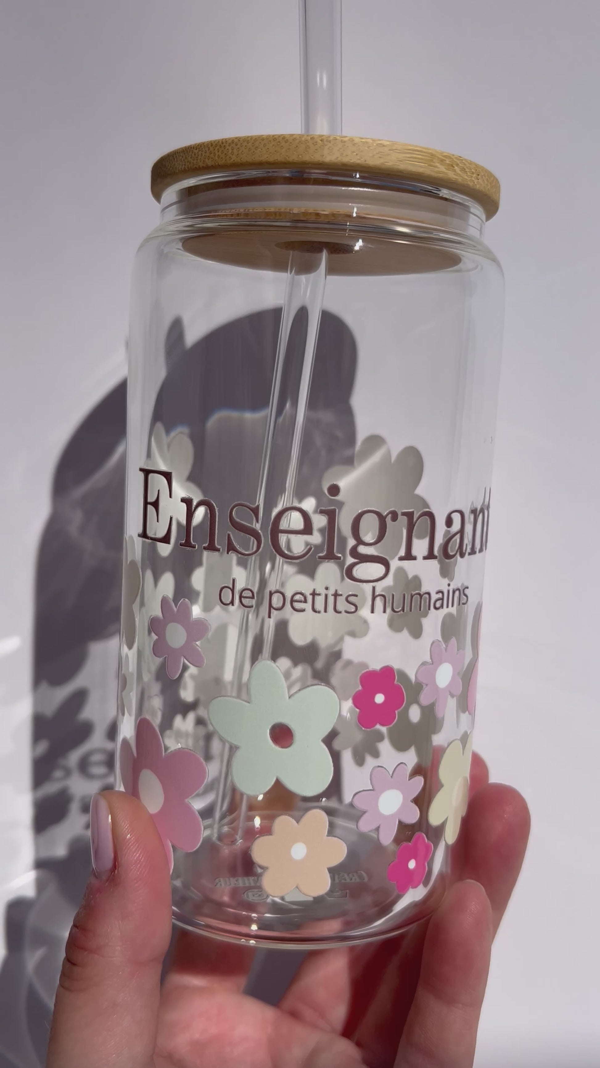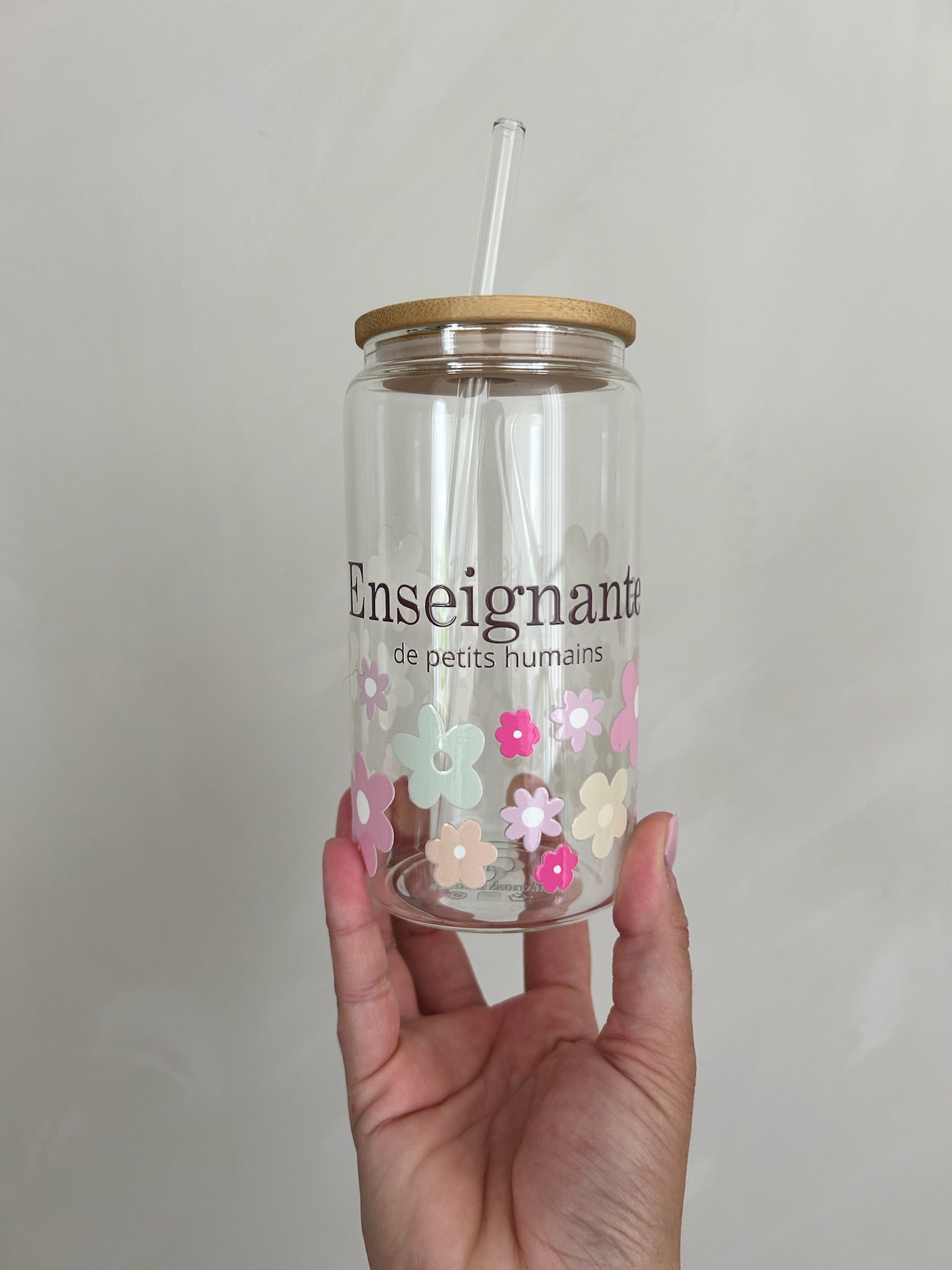Tumbler en verre avec couvercle et paille (16 oz) - Enseignante 🌺